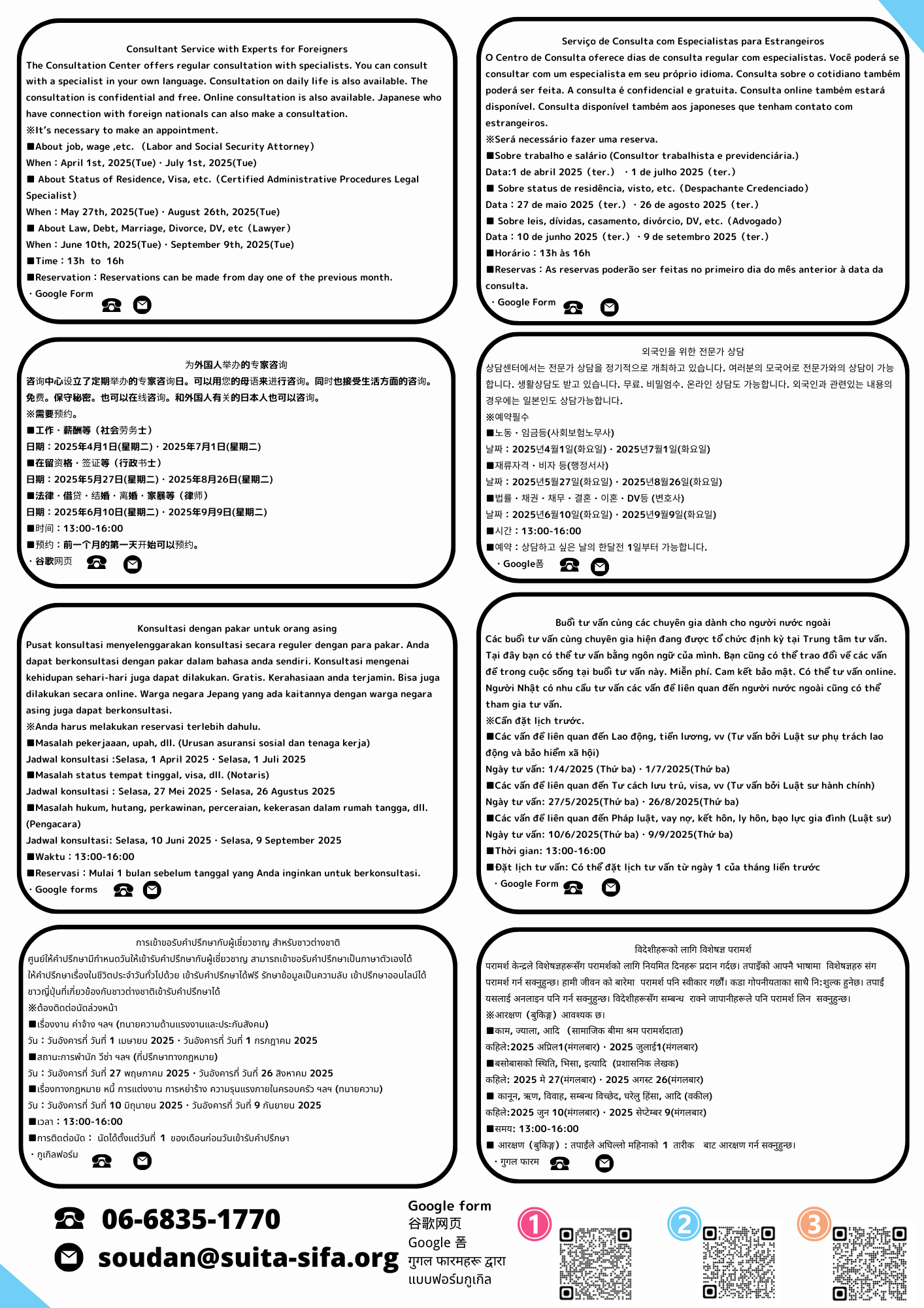 相談(そうだん)センターでは定期的(ていきてき)に専門家(せんもんか)に相談(そうだん)できる日(ひ)があります。あなたのことばで専門家(せんもんか)と相談(そうだん)できます。生活(せいかつ)の相談(そうだん)も受(う)け付(つ)けます。 無料(むりょう)。秘密(ひみつ)を守(まも)ります。オンラインもできます。外国人(がいこくじん)につながりのある日本人(にほんじん)も相談(そうだん)できます。 ※予約(よやく)をしなければなりません。 ■法律(ほうりつ)・借金(しゃっきん)・結婚(けっこん)・離婚(りこん)・DVなど(弁護士(べんごし))いつ:2025年(ねん)4月(がつ)1日(にち)(火(か)ようび)時間(じかん):13:00-16:00 ■予約(よやく)3月(がつ)1日(ついたち)から予約(よやく)できます。。・TEL 06-6835-1770・E-mail soudan@suita-sifa.org・Googleフォーム ■どこ吹田市(すいたし)国際(こくさい)交流(こうりゅう)協会(きょうかい)/SIFA阪急(はんきゅう)南千里(みなみせんり)駅(えき) すぐ
